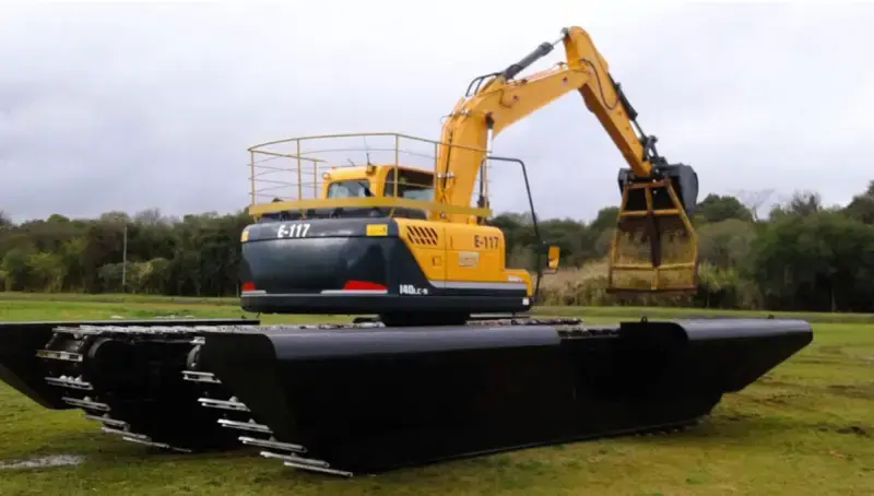 Esse tipo de equipamento pesado é amplamente utilizado em projetos de drenagem, dragagem ambiental e manutenção de corpos hídricos, onde equipamentos convencionais não conseguem operar com eficiência.