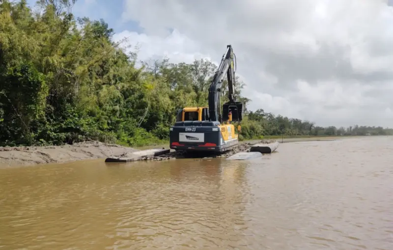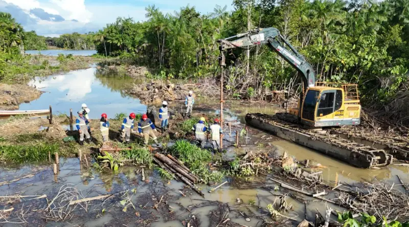 Para garantir segurança e desempenho técnico, a Tendasa aplicou soluções específicas, com destaque para o uso de escavadeiras anfíbias, fundamentais para garantir estabilidade e operação segura.