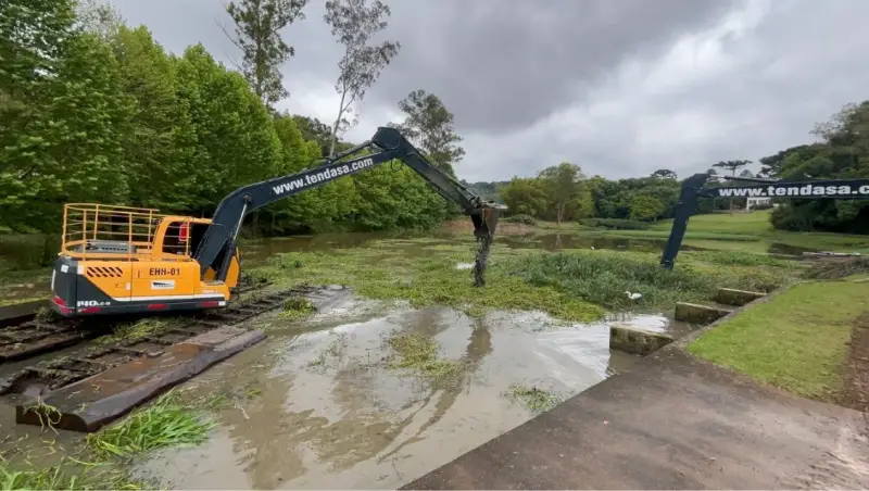 Para garantir segurança e desempenho técnico, a Tendasa aplicou soluções específicas, com destaque para o uso de escavadeiras anfíbias, fundamentais para garantir estabilidade e operação segura.
